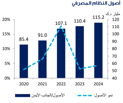 وقال المركزي أن القطاع المصرفي أظهر قدرته على التقدم، حيث سجلت أصول القطاع معدل نمو بلغ %4.3 في عام 2024، مقارنة بـ 3.2% في العام السابق. وبالقيمة المطلقة، نمت أصول البنوك 4.8 مليار دينار لتصل إلى 115.2 مليار دينار في نهاية عام 2024.