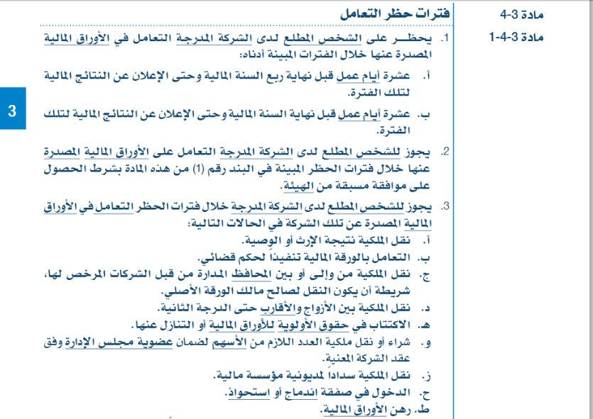 – فترات حظر التعامل في الأوراق المالية للأشخاص المطلعين – على أنه يحظر على الشخص المطلع لدى الشركة المدرجة التعامل في الأوراق المالية المصدرة عنها خلال الفترات التالية: