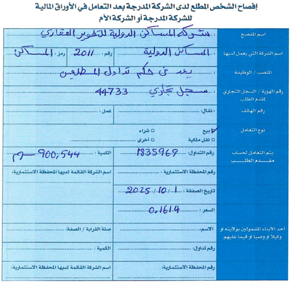 هل كانت هناك موافقة مسبقة على صفقة البيع التي تم تنفيذها على سهم “أسيكو” من قِبل من هو في حكم المطلع، شركة “مساكن”، خصوصاً وأن الصفقة تمت في 1 أكتوبر وفق الإفصاح، ولم يتضمن الإفصاح أي إشارة إلى أن هناك استثناء أو موافقة من الجهات الرقابية؟