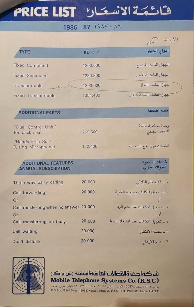 وقد أصدرت شركة “الهواتف” أول نشرة “بروشور” لأسعار الهواتف المتنقلة وملحقاتها وخدماتها الإضافية عن عام 1986 و1987، فكانت أسعار الهواتف تتراوح ما بين 1200 إلى نحو 1350 دك، وقد كانت أحجامها كبيرة نسبياً وأوزانها ثقيلة أيضاً بأكثر من 2 كيلو جرام للجهاز مع البطارية، كما كانت هناك 6 خدمات إضافية بواقع 20 دك سنوياً لكل خدمة (كما يظهر في صورة “البروشور” المرفق)، علماً بأنه تم تغيير الاسم المختصر للشركة في البورصة من “هواتف” إلى “زين” خلال عام 2007.