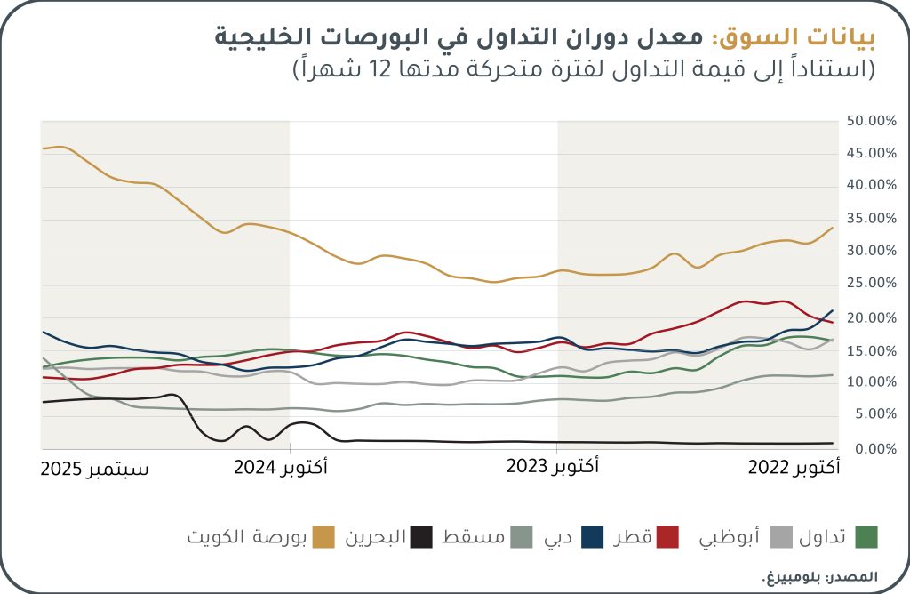 وعليه، واصلت سرعة التداول (معدل دوران التداول) لسوق المال الكويتي مسارها التصاعدي، متجاوزةً نسبة 45% ومتفوقةً على نظيراتها في أسواق دول مجلس التعاون الخليجي. ذلك وتشير سرعة التداول إلى زخم السوق، وهو مقياس يُحتسب كنسبة إجمالي قيمة التداول إلى إجمالي القيمة السوقية. كما سجّل مؤشر السوق العام أعلى معدل نمو مقارنة بالمؤشرات الإقليمية الأخرى، محققاً أداءً بنسبة 19.47% خلال فترة التسعة أشهر المنتهية في 30 سبتمبر 2025.