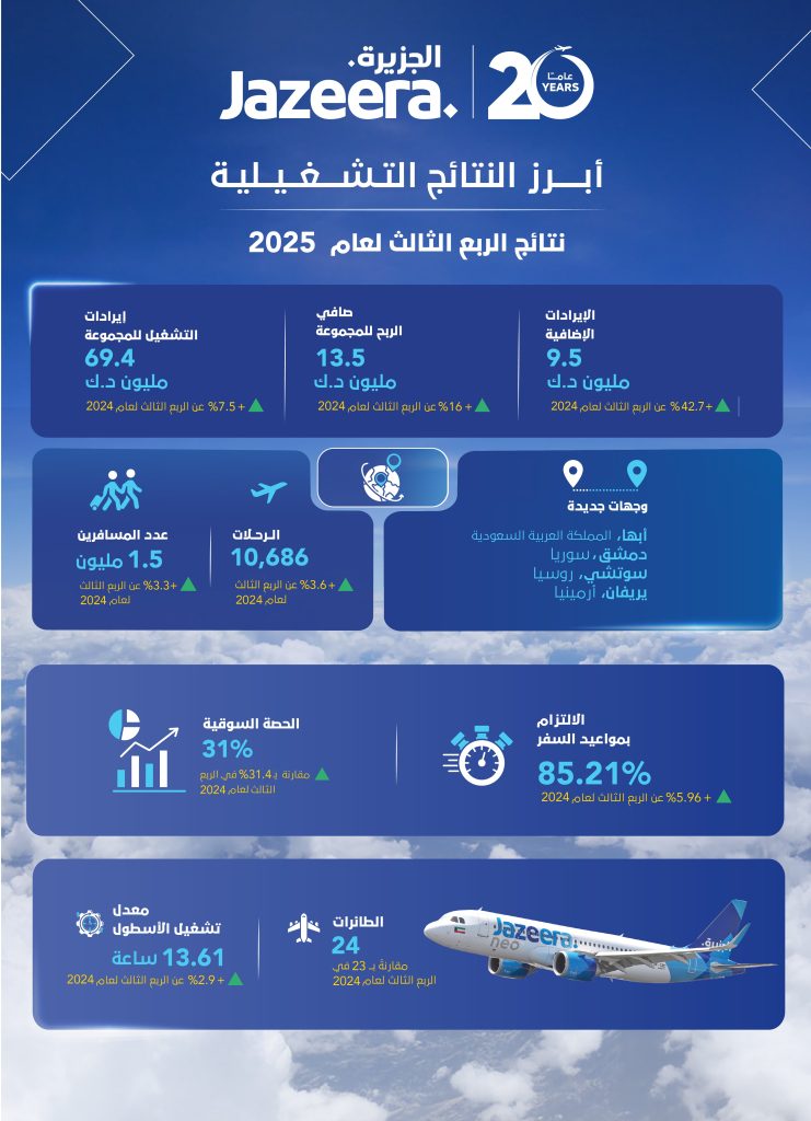 أعلنت طيران الجزيرة، وهي شركة الطيران منخفضة التكلفة الرائدة في الكويت، أنها سجلت أفضل أداء مالي فصلى لها خلال 20 عاماً من التشغيل، حيث حققت صافي أرباح بلغ 13.5 مليون دينار كويتي في فترة الثلاثة أشهر المنتهية في 30 سبتمبر 2025، وذلك بارتفاع بنسبة 15.9% مقارنة بالفترة نفسها من العام الماضي.