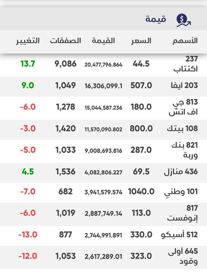 جدول الشركات الأعلى تداولاً على صعيد القيمة