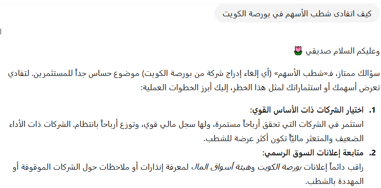 تم التوجه إلى “الذكاء الاصطناعي”، “شات جي بي تي”، والاستعانة به للإجابة عن السؤال الذي يشغل صغار المستثمرين قبل الشركات، “كيف أتفادى شطب الأسهم في بورصة الكويت؟”