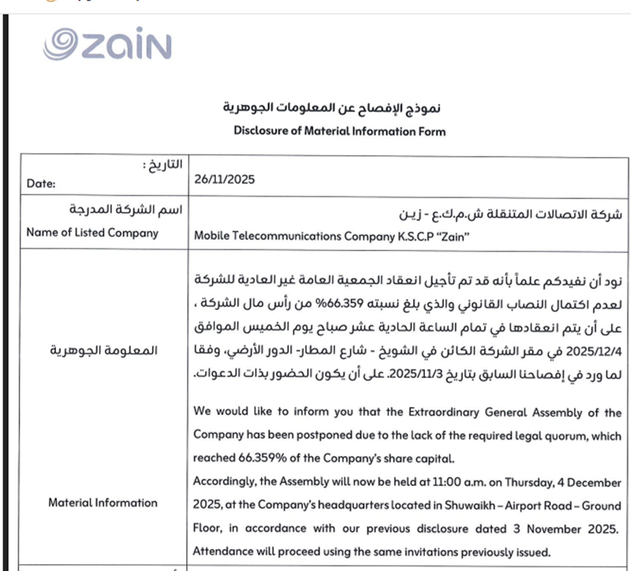 “زين” نموذج شركة تحتوي على ملكيات أجنبية والجمعية تتأجل من 26 نوفمبر إلى 4 ديسمبر