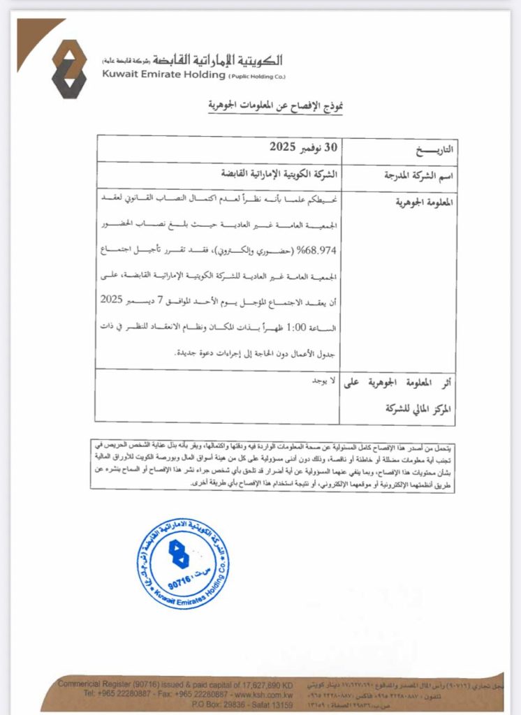 الكويتية الإماراتية نموذج لشركة مملوكة بأغلبية لمستثمر إماراتي مؤسسي … الجمعية العمومية تأجلت أسبوعاً لعدم اكتمال النصاب وستنعقد بمن حضر، لماذا لا تتحقق المرونة تيسيراً على المستثمر الأجنبي وتؤجل ساعتين؟