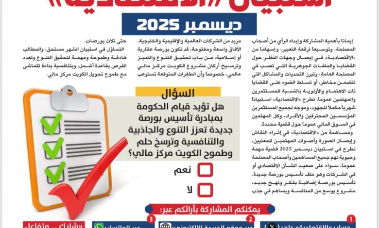 ومساهمة من “الاقتصادية” في إثراء النقاش وإيصال الصورة وأصوات المهتمين للمعنيين، نطرح في استبيان ديسمبر 2025 قضية مهمة وحيوية تهم جميع المساهمين وأصحاب المصلحة عموماً، سواء على صعيد الشأن الاقتصادي أو في الشركات وهو ملف تأسيس بورصة جديدة. تأسيس بورصة إضافية بفكر ونهج جديد، مشروع يوسع من المنافسة ويساهم في جذب مزيد من الشركات العالمية والإقليمية والخليجية. الآفاق واسعة ومفتوحة، قد تكون بورصة عقارية أو إسلامية، من باب تحقيق التنوع والتميز وترسيخ أركان مشروع الكويت مركز مالي عالمي، خصوصاً وأن الطفرات المتوقعة تستوعب حتى ثلاث بورصات.