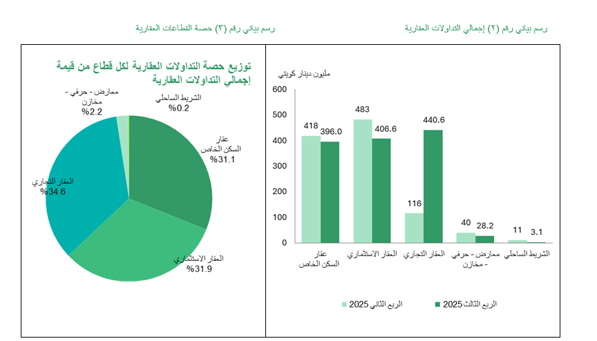 قفزت قيمة تداولات العقارات التجارية إلى مستوى استثنائي غير مسبوق سجل 440.6 مليون دينار في الربع الثالث 2025 ، أي حوالي أربعة أضعاف قيمتها في الربع الثاني 2025، بالتالي فاقت ضعف مستواها في الربع الثالث من عام 2024.