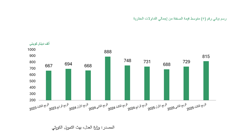 ارتفع مؤشر متوسط قيمة الصفقة العقارية الإجمالية إلى 815 ألف دينار بنهاية الربع الثالث 2025 بنسبة 11.7% عن الربع الثاني 2025 ويعد أعلى بنسبة 8.9% على أساس سنوي.