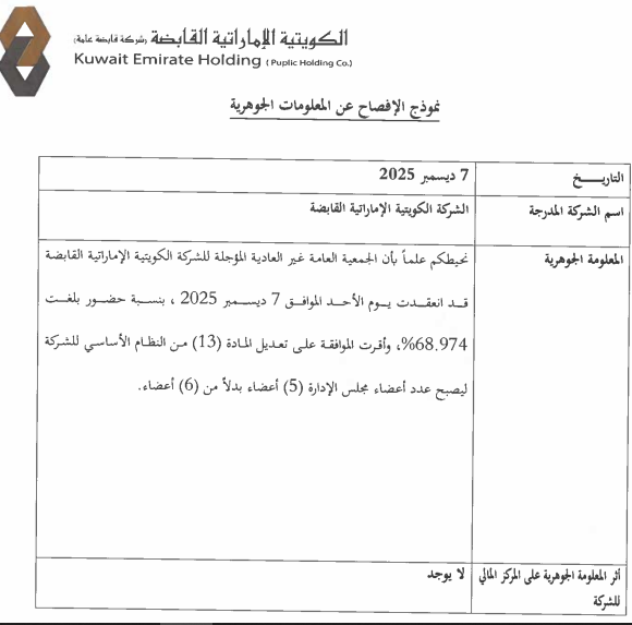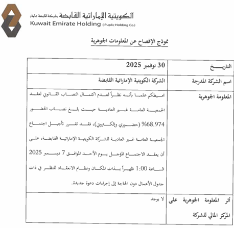 عمومية “الكويتية الإماراتية”… نصاب الجمعية الثانية بعد التأجيل نفس الجمعية الأولى …. فما فائدة التأجيل؟