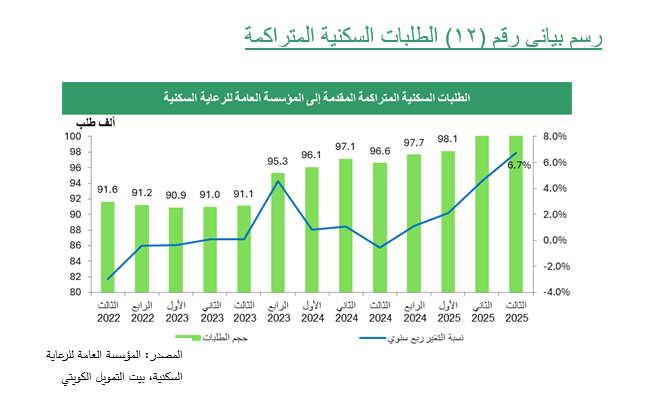 وتواصل المؤسسة العامة للرعاية السكنية تلبية طلبات المواطنين في الحصول على سكن ملائم، ووفق آخر تقرير عن مشروعات المؤسسة الإسكانية في يوليو 2025 يصل عدد الطلبات الإسكانية القائمة إلى 103.1 ألف طلب بزيادة 6.7% على أساس سنوي ، وقد تعود تلك الزيادة إلى حرص المواطنين على الاستفادة من قانون التمويل العقاري المرتقب ، وتمكنت المؤسسة وفقاً لآخر تقرير متاح في يونيو 2025 من إنشاء عدد كبير من القسائم السكنية التي صدر لها إذن بناء منها قسائم وزعت بالفعل على مستحقيها وأخرى جاهزة للتسليم، كما في مدينة المطلاع التي سلمت المؤسسة فيها حوالي 27.7 ألف قسيمة إضافة إلى 28.3 ألف قسيمة تعد جاهزة للتسليم، كما سلمت المؤسسة ما يزيد على 3.2 ألف قسيمة في جنوب عبدالله المبارك ونحو 3.3 ألف قسمية جاهزة للتسليم في المنطقة ، إضافة إلى حوالي 1.4 ألف قسيمة سلمت في خيطان بجانب أكثر من 1.4 ألف قسيمة جاهزة للتسليم بالمنطقة.