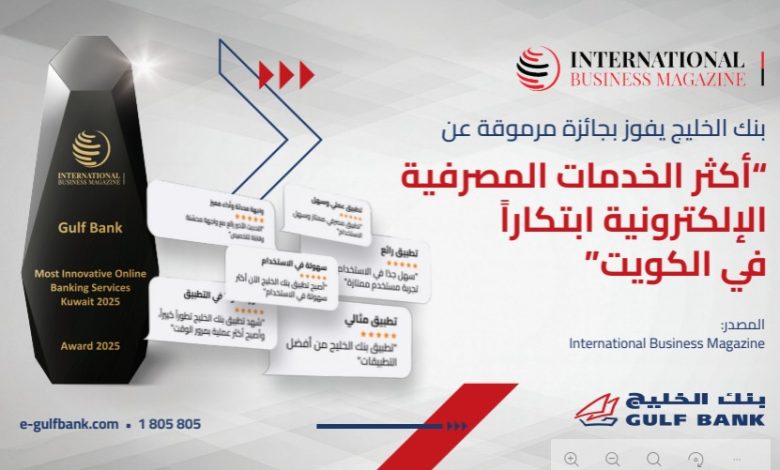 حصد بنك الخليج جائزة ” الأكثر ابتكاراً في الخدمات المصرفية الإلكترونية في الكويت 2025″ من مجلة الأعمال الدولي (International Business Magazine) ، وذلك تقديراً لتميّزه في تطوير منظومة الخدمات المصرفية الرقمية وتقديم تجارب مبتكرة تلائم احتياجات العملاء وتواكب توقعاتهم المتغيرة في السوق الكويتي.