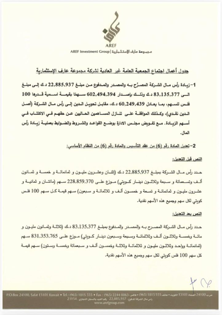 * زيادة رأس المال بنسبة 72.471%، وذلك بزيادته من 22.885 مليون دينار كويتي إلى 83.135 مليون دينار كويتي.