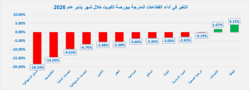 تكبدت بورصة الكويت خسائر خلال شهر يناير 2026، بعد الأداء القوي المُسجل خلال العام الماضي، بضغط زيادة التوترات الجيوسياسية، وعمليات جني الأرباح، إذ شهدت تراجعاً خلال 3 أسابيع من الشهر الحالي، مقابل نمواً وحيداً.