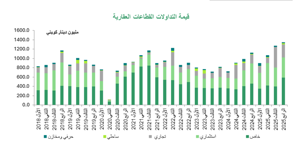 وقد ارتفعت قيمة التداولات التي يتم تجميعها على أساس شهري خلال الربع الرابع 2025 حيث تخطت 1.3 مليار دينار كويتي بزيادة 5.6% على أساس ربع سنوي، مدفوعة بزيادة قيمة التداولات في السكن الخاص إلى حوالي 587 مليار دينار في الربع الرابع 2025 بزيادة 48.3% عن الربع السابق له، نتيجة بارتفاع الطلب عليه خلال الربع الرابع إلى 1,247 صفقة بنسبة 20.5% عن الربع الثالث 2025، كما ارتفعت تداولات العقار الاستثماري إلى 436 مليون دينار في الربع الرابع 2025 بنسبة 7.3% برغم انخفاض ربع سنوي محدود للطلب عليه مسجلاً 421 صفقة بنسبة 3.4%، فيما انخفضت قيمة التداولات على فئة العقار التجاري مسجلة 272 مليون دينار بنسبة 38.4% عن مستواها في الربع الثالث من 2025 مع انخفاض حجم الطلب على هذه الفئة من العقارات إلى 70 صفقة بنسبة 7.9% عن حجمه في الربع الثالث. وقفزت قيمة التداولات على فئة عقارات الشريط الساحلي إلى نحو 33 مليون دينار من خلال سبع صفقات، مقابل 3 مليون دينار في الربع الثالث تمت عبر صفقتين فقط، فيما انخفضت قيمة التداولات على فئة العقارات الحرفية والمخازن مسجلة 17 مليون دينار في الربع الرابع 2025 بنسبة 37.1% وشهد الطلب عليها انخفاضاً إلى 12 صفقة بنسبة 14.3% عن الربع السابق له.