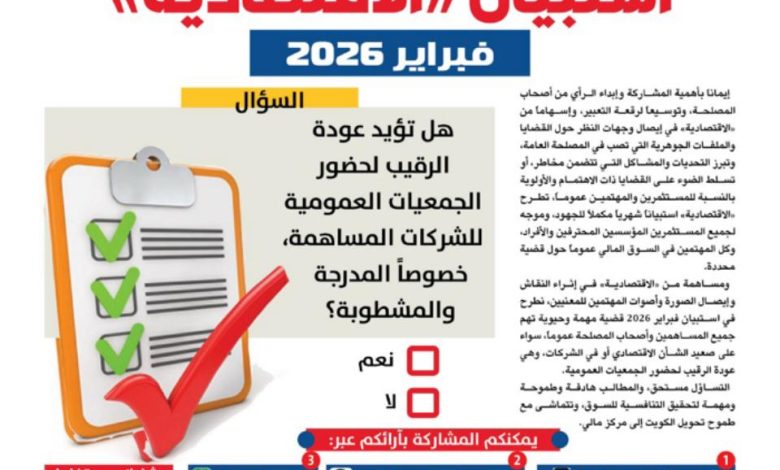 ومساهمة من “الاقتصادية” في إثراء النقاش وإيصال الصورة وأصوات المهتمين للمعنيين، نطرح في استبيان فبراير 2026 قضية مهمة وحيوية تهم جميع المساهمين وأصحاب المصلحة عموماً، سواء على صعيد الشأن الاقتصادي أو في الشركات، وهي عودة الرقيب لحضور الجمعيات العمومية.