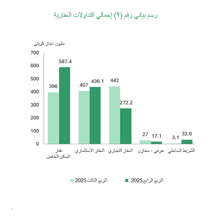 ارتفعت التداولات العقارية على فئة السكن الخاص إلى 587.4 مليون دينار في الربع الرابع 2025 بنسبة استثنائية قدرها 48.3% عن قيمتها في الربع الثالث 2025، وبنسبة 28.9% على أساس سنوي.