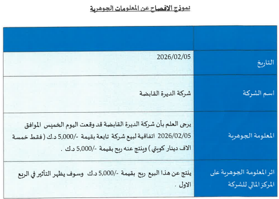 في صفقة ناجحة وقياسية هي الأعلى ربحاً لعام 2026، أعلنت شركة الديرة القابضة أنه تم توقيع اتفاقية لبيع شركة تابعة “غير معروفة الاسم أو النشاط” بقيمة 5000 خمسة آلاف دينار كويتي، والربح 5000 خمسة آلاف دينار كويتي.