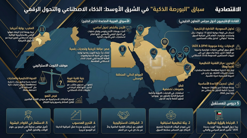 يكشف المشهد الإقليمي أن سباق التحول نحو «البورصة الذكية» قد انطلق فعلياً في المنطقة، مع تقدم واضح للسعودية والإمارات. بورصة الكويت، بإرثها الريادي وبنيتها التقنية الجيدة، تمتلك مقومات حقيقية للحاق بالمجموعة المتقدمة، لكن نافذة الفرصة لن تظل مفتوحة إلى الأبد.