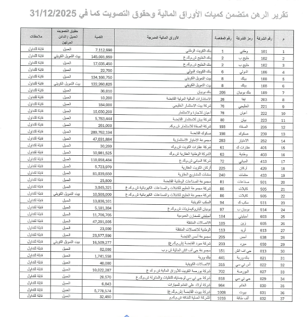 يضم التقرير الدوري عن ديسمبر 2025 لمحافظ الأسهم المرهونة 37 محفظة، تضم ملكيات متعددة لعدد من الشركات المدرجة كضمانات ورهونات مكملة، حيث لا تزال الأسهم تحتفظ بجاذبيتها.