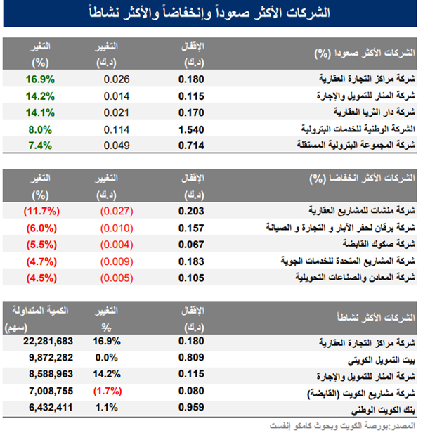 وجاء سهم “مراكز” في مقدمة نشاط الكميات بحجم بلغ 22.28 مليون سهم؛ فيما تصدر السيولة سهم “بيتك” بقيمة 7.99 مليون دينار.
