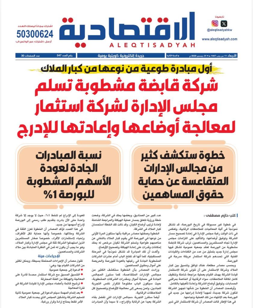 كما أشارت “الاقتصادية” في عددها الصادر في 31 ديسمبر 2025، بشأن مشروع تسليم مقاليد إدارة شركة قابضة مشطوبة إلى شركة استثمار محترفة لتقوم بعملية إعادة الهيكلة، فقد تحقق المشروع على أرض الواقع بدخول ممثلين من المركز المالي الكويتي في مواقع قيادية في مجلس إدارة شركة عربي القابضة الجديد. ممثلي المركز المالي لهم مطلق الصلاحيات في المعالجة والإجراءات، وهما عبداللطيف وليد النصف رئيساً لمجلس الإدارة، بخبرات طويلة ومتنوعة ورؤية عصرية ومتجددة ، يعاونه قيادة ذات خبرة ممثلة في عبدالرزاق الرزوقي على رأس الجهاز التنفيذي، مدعماً بخبرات تاريخية تضم كل من صقر المعوشرجي، وخبرة شبابية تضم عبدالله طارق المعوشرجي، ممثلين عن كبار الملاك المسيطرين، إضافة إلى فهد الدلالي وقتيبة الشاهين.