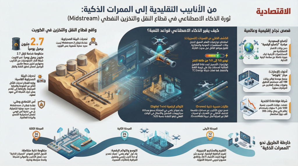 من «الأنابيب التقليدية» إلى «الممرات الذكية»: كيف يمكن للذكاء الاصطناعي أن يُحدث نقلة نوعية في قطاع النقل والتخزين النفطي (Midstream)؟