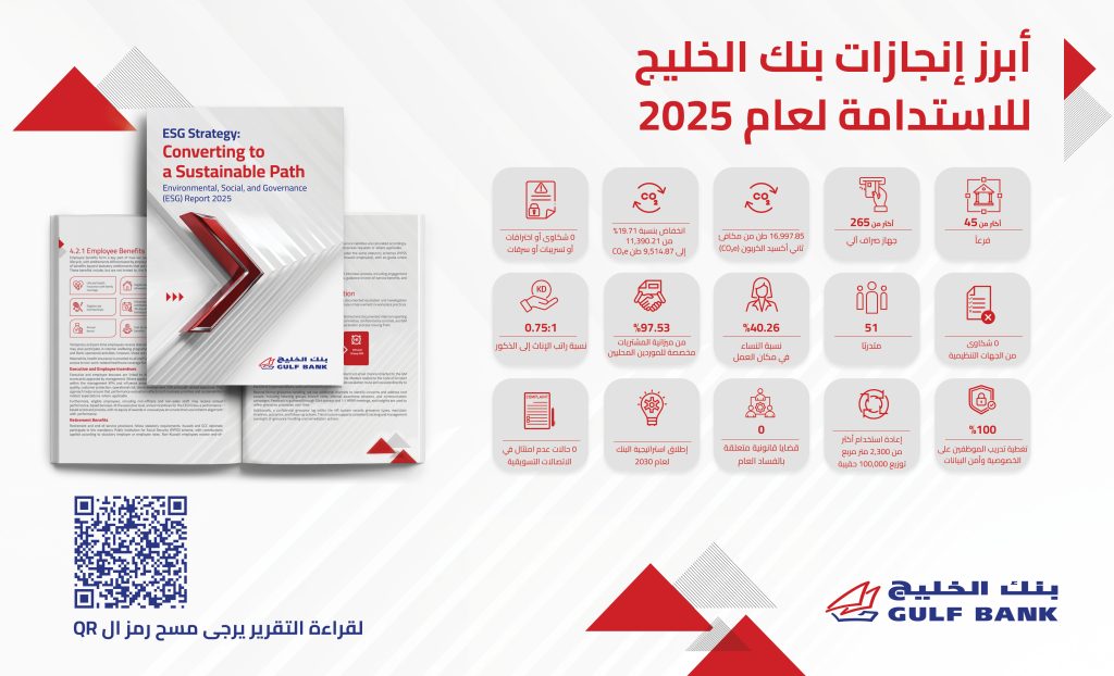 أصدر بنك الخليج التقرير السنوي السادس للاستدامة لعام 2025، تحت عنوان “التحول نحو مسار مستدام”، ليعكس مدى التقدم الذي حققه البنك في مجالات الاستدامة، والتزامه المستمر بتعزيز المعايير البيئية والاجتماعية والحوكمة، وترسيخها ضمن مختلف عملياته وأنشطته المصرفية، بما يتماشى مع رؤية الكويت الجديدة 2035، والمبادرة العالمية لإعداد التقارير (GRI)، ومعايير مؤشر MSCI للاستدامة وأهداف الأمم المتحدة للتنمية المستدامة (SDGs) وكذلك الدليل الإرشادي لإفصاحات الاستدامة الصادرة عن بورصة الكويت.