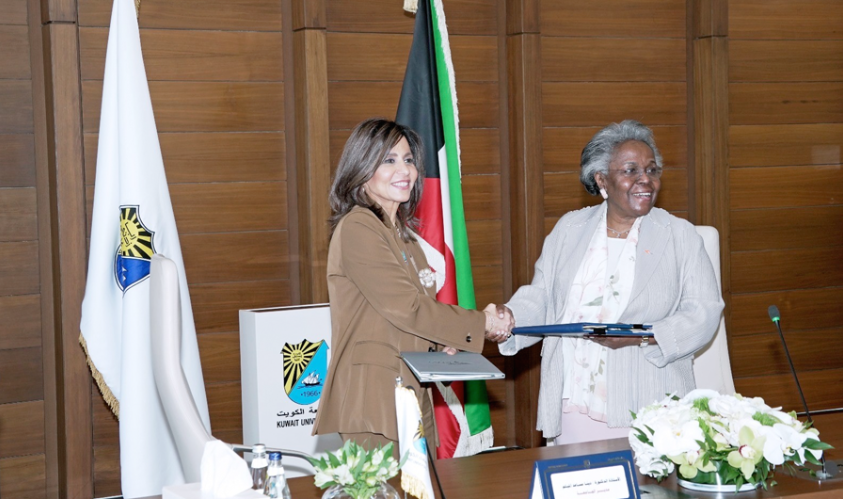 مدير جامعة الكويت الدكتورة دينا الميلم والمدير العام لمؤسسة الكويت للتقدم العلمي الدكتورة أمينة فرحان توقعان اتفاقية تأسيس وتشغيل مركز الكويت الوطني لأبحاث الفضاء بين جامعة الكويت و«التقدم العلمي».